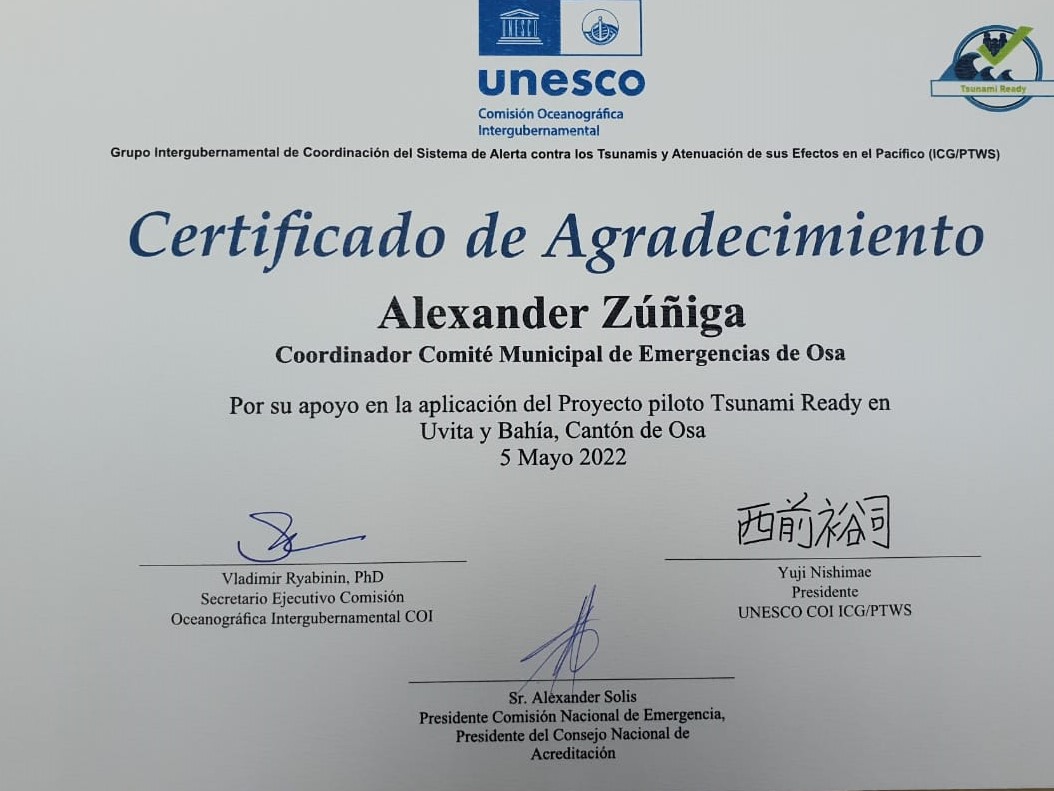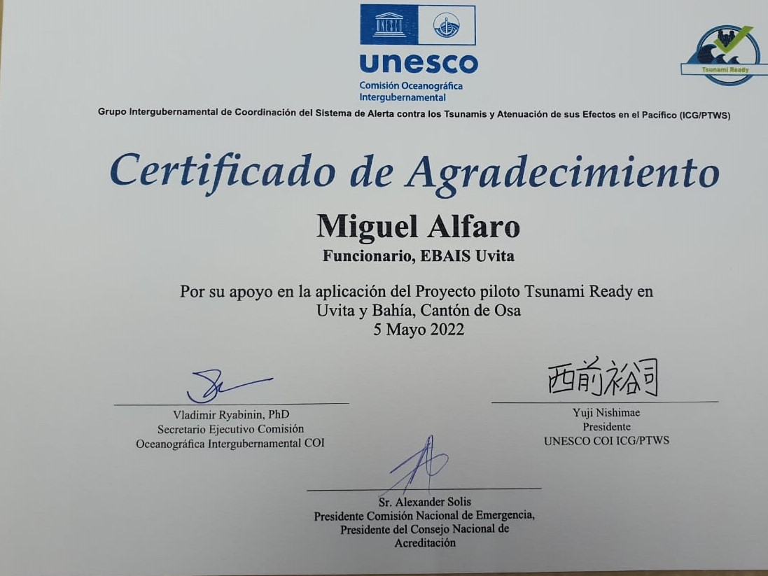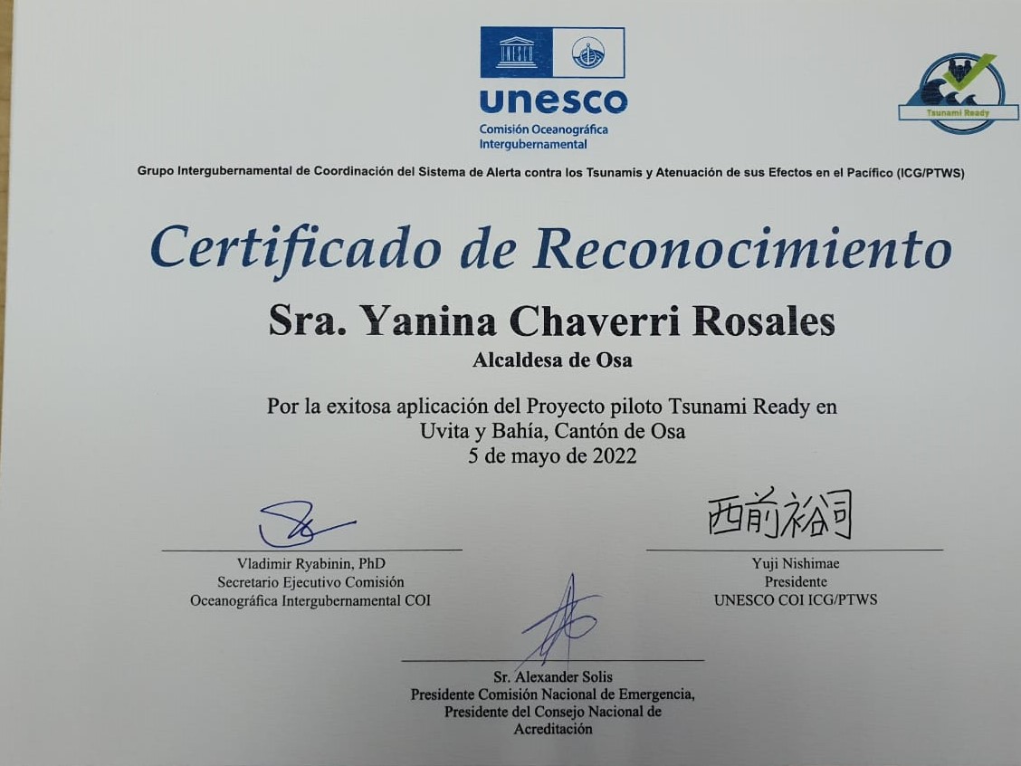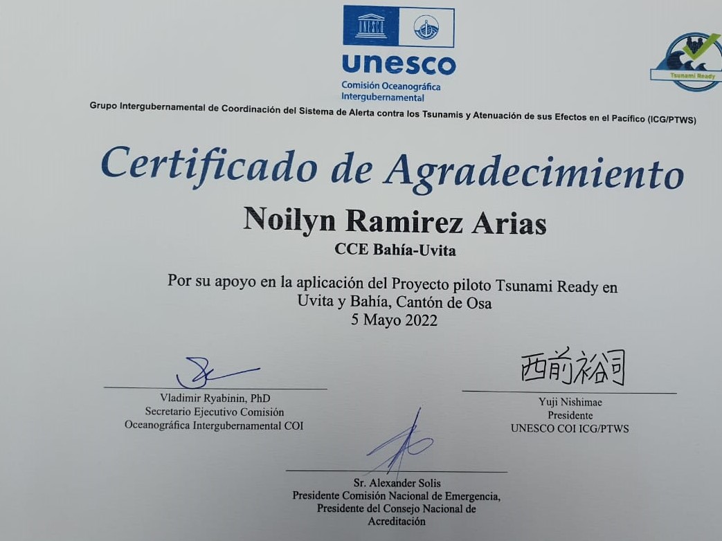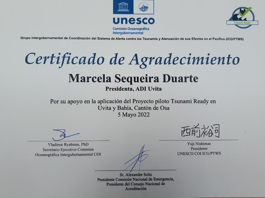 In July 2021, Uvita-Bahía, Costa Rica, received recognition as Tsunami Ready under the Pilot Community Performance Based Tsunami Recognition Programme being developed by Intergovernmental Oceanographic Commission (IOC) of United Nations Educational, Scientific and Cultural Organization (UNESCO). As part of the efforts in Costa Rica to improve an end-to-end tsunami early warning system, Uvita-Bahía fulfilled the Programme’s guidelines; thus, empowering its vulnerable coastal communities to take effective action in the event of a potential tsunami and save lives. Outputs included the creation of an inundation and evacuation maps for the community, as well as the installation of signage for evacuation routes, assembly points and tsunami hazard zones. The National System for Monitoring of Tsunamis (SINAMOT) - National University of Costa Rica (UNA) also undertook extensive public education, conducted drills, and formulated an emergency operations plan (EOP). Schools, businesses and the public also actively participated in a number of activities during the implementation process. The Tsunami Ready effort was led by the community supported by SINAMOT and CNE. The Tsunami Ready Programme incorporates risk knowledge assessment, preparedness actions and response planning with recognition being granted upon the satisfactory completion of a verification process confirming fulfilment of the guidelines.
