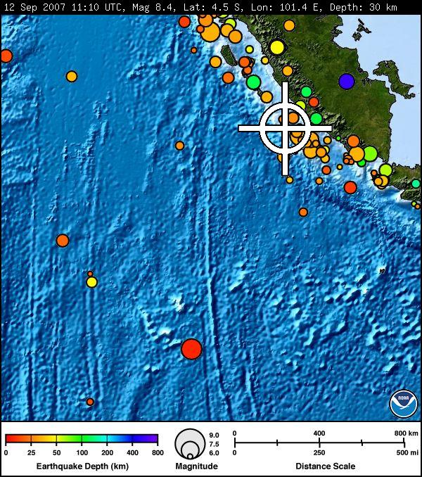 This earthquake (12 September, 11:10 UTC, 6:10 pm local time) occurred off the southern coast of Sumatra about 130 km (85 miles) from Bengkulu Sumatra, at 4.517°S, 101.382°E with a preliminary depth of 30 km (19 miles). It was a major earthquake with a magnitude of 8.4, felt over a large area. A tsunami of 2.2 m has been measured at Padang Indonesia. It will be several hours before the major impact of the earthquake and tsunami impact the coastline will be known, given the darkness of nighttime since the earthquake happened.