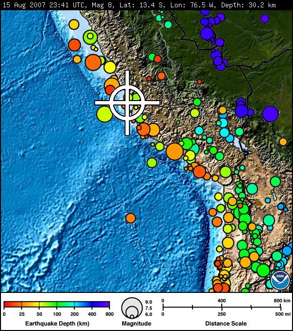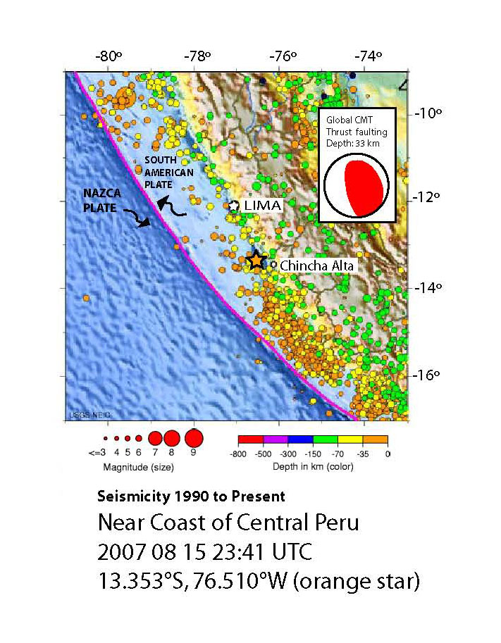 This earthquake (2341 UTC) occurred off the coast of Peru about 45 km (25 miles) from Chincha Alta, Peru and 150 km (95 miles) from Lima. The epicenter is calculated to be at 13.358°S, 76.522°W at a depth of 30.2 km.