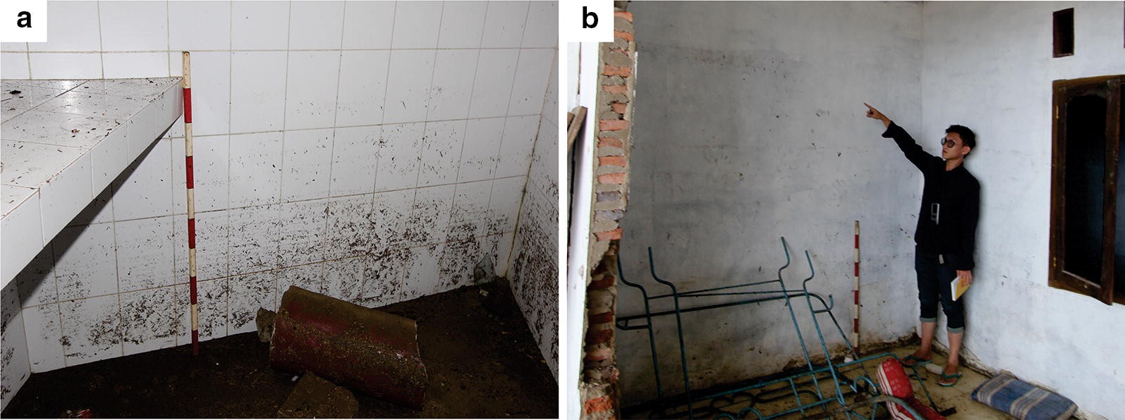 (b) damaged front wall house with flow depth around 2 m