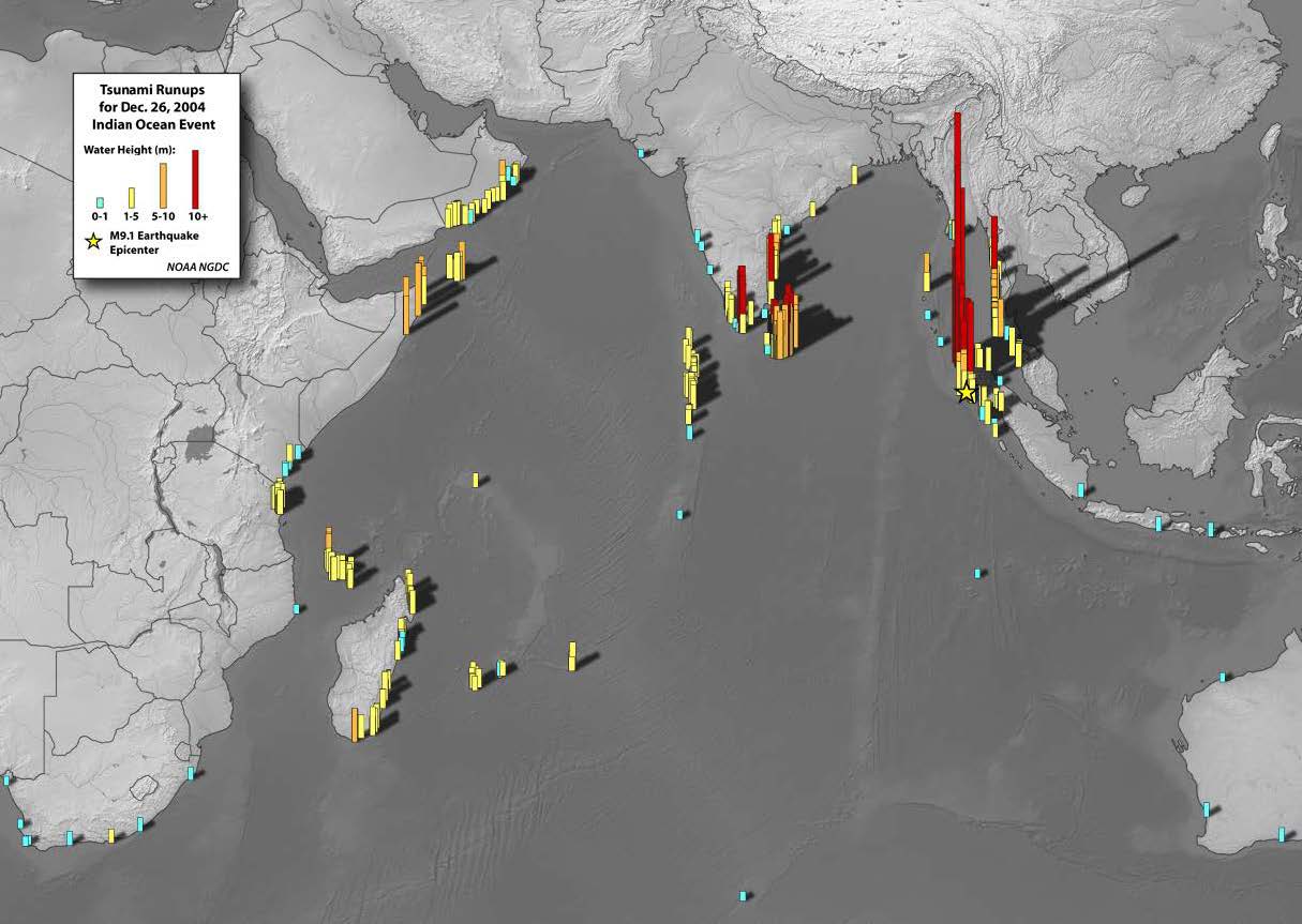 According to the NOAA National Geophysical Data Center / World Data Service for Geophysics Global Historical Tsunami Event database 2,229 tsunamis have occurred in the world since 2000 B.C. Of these tsunamis, 1,212 are considered confirmed tsunamis. In the Indian Ocean region, 69 confirmed tsunamis have been observed since the beginning of the 18th Century, and 22 (32%) of these events caused deaths. Three of these deadly tsunamis occurred after the December 26, 2004 event. The majority of Indian Ocean tsunamis were generated by earthquakes (88%), the remainder resulted from volcanic eruptions (6%), landslides (1%), and unknown causes (4%).