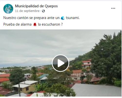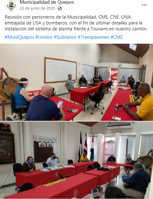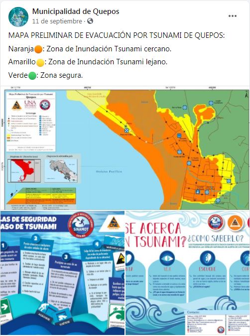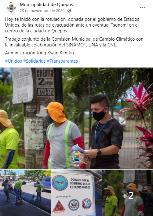 In April 2022, Quepos Canton (territory), Costa Rica, received recognition as Tsunami Ready under the Pilot Community Performance Based Tsunami Recognition Programme being developed by Intergovernmental Oceanographic Commission (IOC) of United Nations Educational, Scientific and Cultural Organization (UNESCO). As part of the efforts in Costa Rica to improve an end-to-end tsunami early warning system, Quepos fulfilled the Programme’s guidelines; thus, empowering its vulnerable coastal communities to take effective action in the event of a potential tsunami and save lives. Outputs included the creation of an inundation and evacuation maps, as well as the installation of signage for evacuation routes, assembly points and tsunami hazard zones, in addition to a tsunami alarm. The National System for Monitoring of Tsunamis (SINAMOT) - National University of Costa Rica (UNA) also undertook extensive public education, conducted drills, and formulated an emergency operations plan (EOP). Schools, businesses and the public also actively participated in a number of activities during the implementation process. The Tsunami Ready effort was part of the research project, Participative Strategies for Climate Change at Local Level, UNA and the Joint Project of the Tsunami Unit of IOC/UNESCO and the Men and Biosphere Program of UNESCO to increase tsunami and flooding preparedness for coastal Biosphere Sites. As part of the latter, extensive hazard assessments and preparedness activities were carried on also at Manuel Antonio National Park. The effort was supported by SINAMOT, CNE, SINAC (National System of Consevation Areas), the Municipal Commission for Emergencies at Quepos (CME), the Commission for Climate Change at Quepos as well as the Government of the United States, NORAD and the UNESCO/IOC and ITIC. The Tsunami Ready Programme incorporates risk knowledge assessment, preparedness actions and response planning with recognition being granted upon the satisfactory completion of a verification process confirming fulfilment of the guidelines.