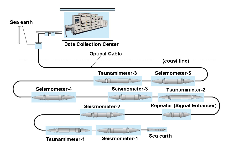 Schematic diagram of cabled ocean system for monitoring earthquakes and tsunamis. Courtesy of Japan Meteorological Agency.