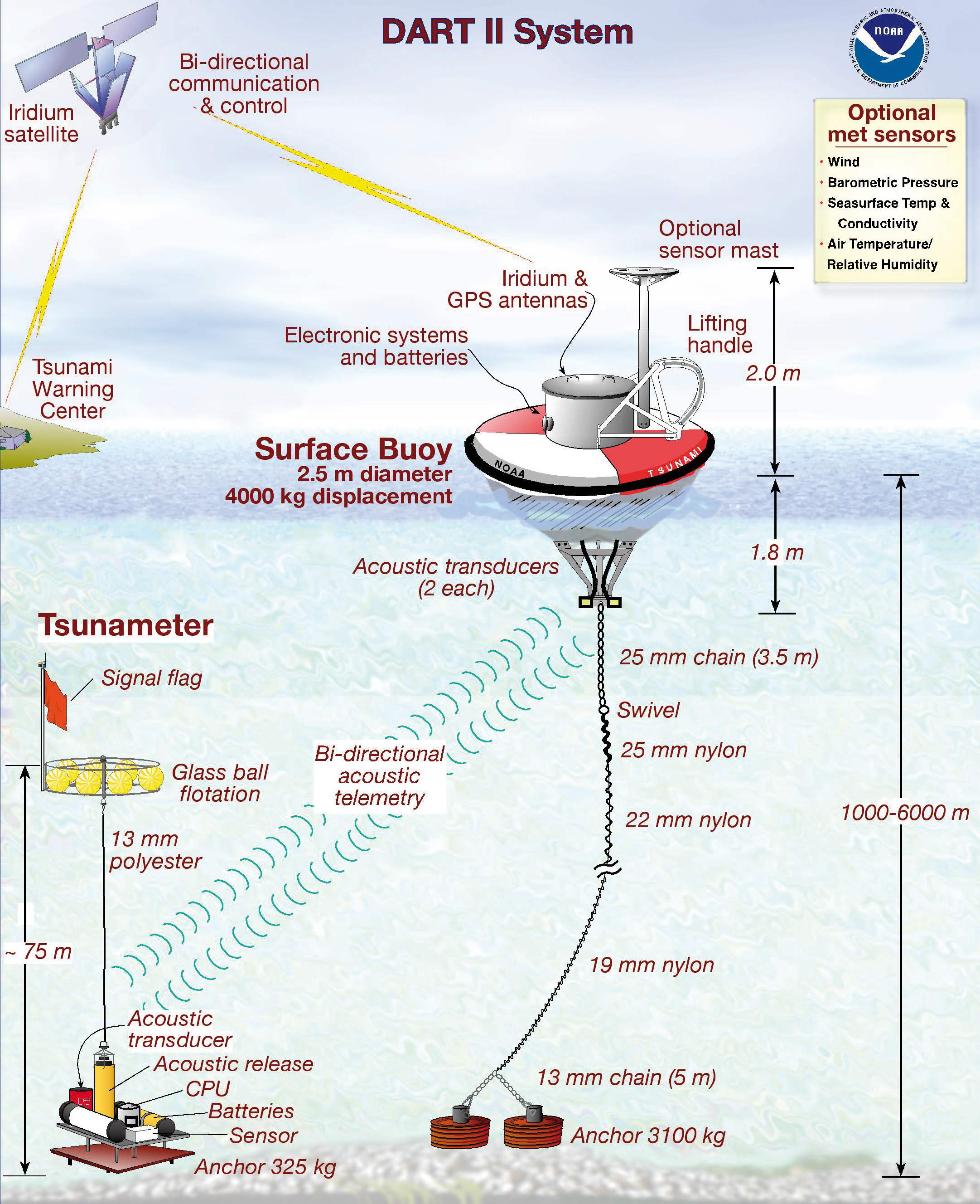 Developed by the US NOAA Pacific marine Environmental Laboratory, the DART® system consists of a seafloor bottom pressure recording system capable of detecting tsunamis on the order of centimetres, and a moored surface buoy for real-time communications. An acoustic link is used to transmit data from the seafloor to the surface buoy. The data are then related via a satellite link to ground stations where signals are demodulated for immediate dissemination to the NOAA tsunami warning centres. The DART® data, along with state-of-the-art numerical modelling capabilities, are part of a tsunami forecasting system package that provides predictions of tsunami impact along site-specific coasts.
