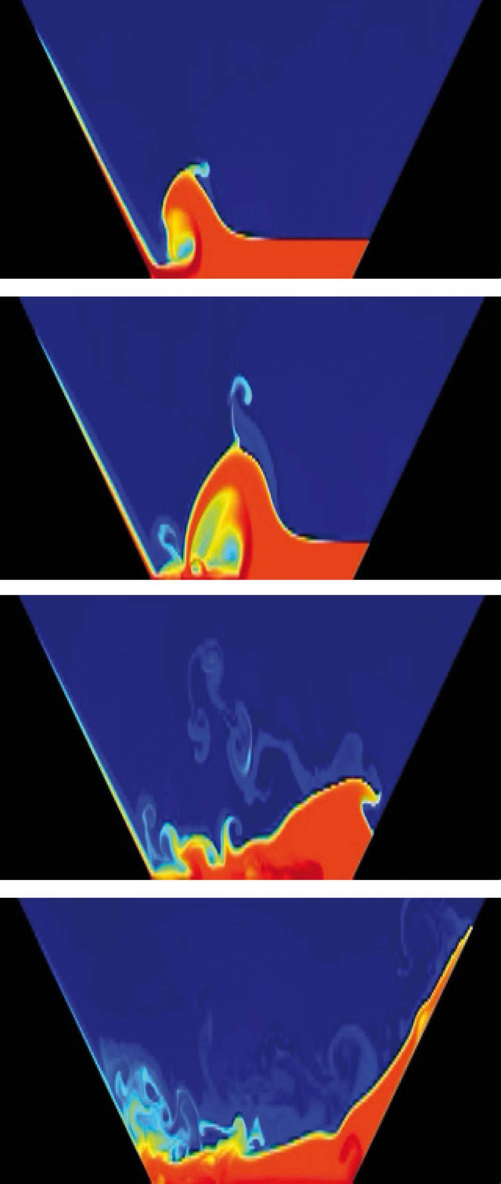 Complex numerical model calculated to match the 1958 Lituya Bay, Alaska landslide-generated local tsunami which caused the largest runup ever recorded (525 m). The complex model matches very closely the detail of the second order eddies and splash effects that laboratory experiments showed. Courtesy of Galen Gisler, Los Alamos National Laboratory.
