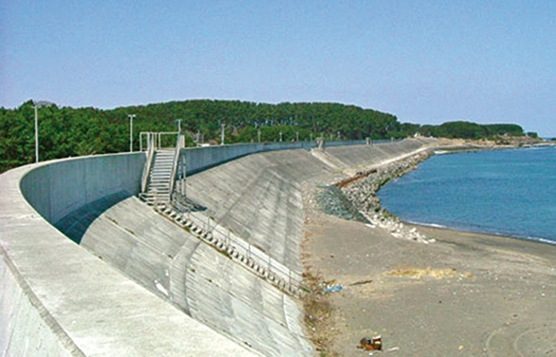Sea wall with stairway evacuation route used to protect a coastal town against tsunami inundation in Japan. Photo courtesy of River Bureau, Ministry of Land, Infrastructure and Transport, Japan.