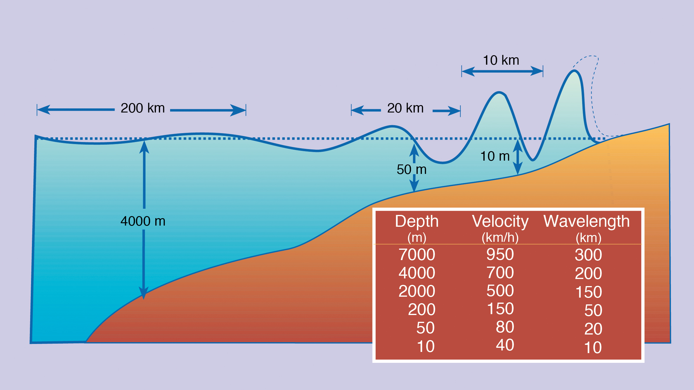 Wave height and water depth. In the open ocean, a tsunami is often only a tens of centimetres high, but its wave height grows rapidly in shallow water. Tsunami wave energy extends from the surface to the bottom in the deepest waters. As the tsunami attacks the coastline, the wave energy is compressed into a much shorter distance creating destructive, life-threatening waves.