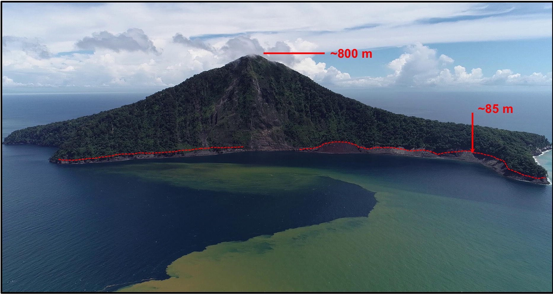 Rakata Island. The tsunami trim line is shown in dashed red and the