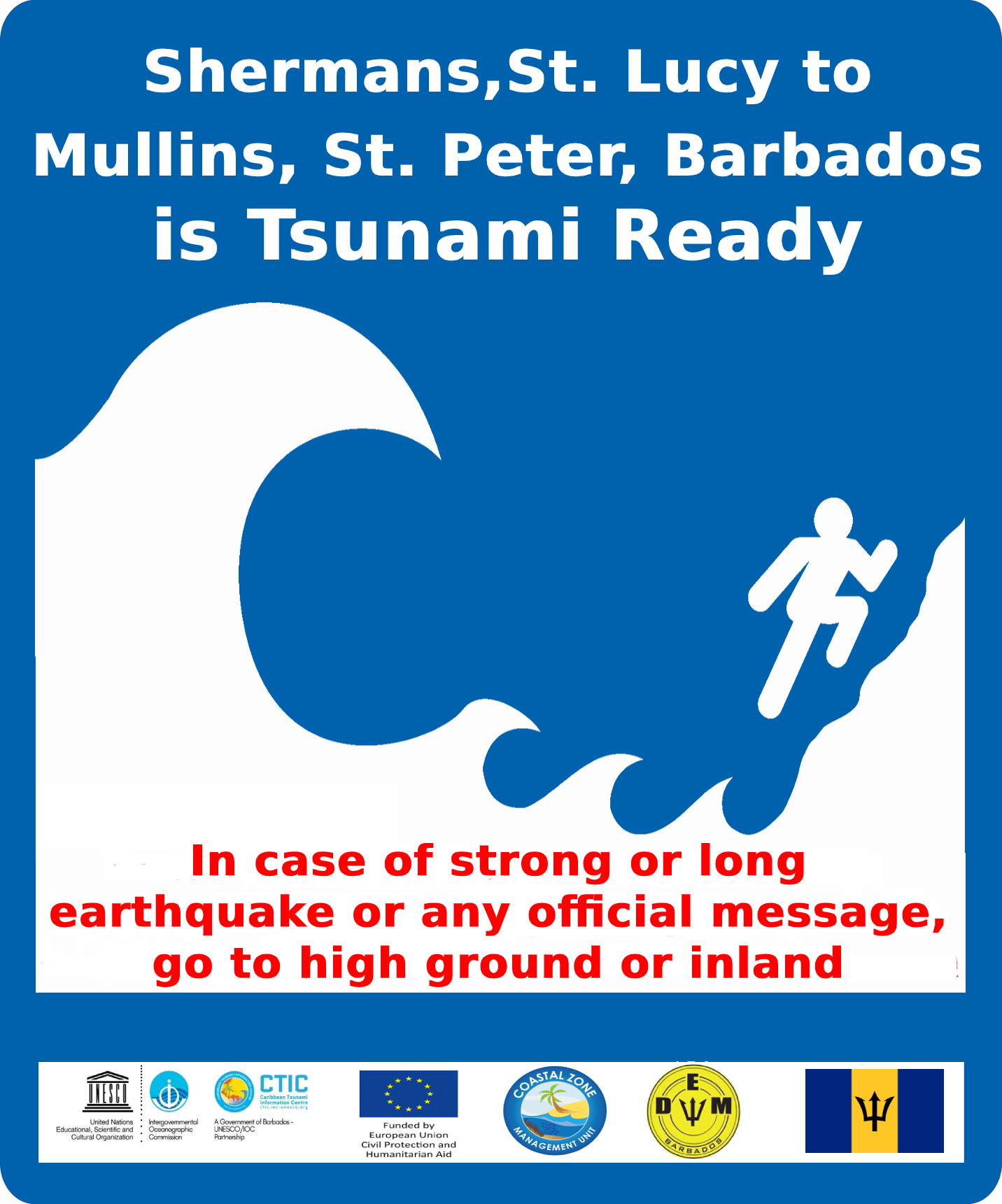 In 2020, Shermans, St. Lucy to Mullins, St. Peter, Barbados, received recognition as Tsunami Ready under the Pilot Community Performance Based Tsunami Recognition Programme being implemented by the United Nations Educational, Scientific and Cultural Organization Intergovernmental Oceanographic Commission (UNESCO/IOC) Intergovernmental Coordination Group for the Tsunami and Other Coastal Hazard Warning Systems for the Caribbean and Adjacent Regions (ICG/CARIBE-EWS). As part of the regional efforts to develop an end-to-end tsunami early warning system, the communities fulfilled the Programme’s guidelines; thus empowering its vulnerable coastal communities to take effective action in the event of a potential tsunami and save lives. The recognition process was implemented by the St. Lucy, St. Peter and St. James District Emergency Organizations under the guidance of the Department of Emergency Management in Barbados. Outputs included the creation of inundation maps and evacuation maps for each community, as well as the provision of communication equipment, and signage for evacuation routes, assembly points and tsunami hazard zones. The communities also undertook extensive public education, conducted drills, and formulated an emergency operations plan (EOP). The Tsunami Ready effort was part of the project, “Strengthening Capacities of Early Warning and Response for Tsunamis and Other Coastal Hazards in the Caribbean”. It was sponsored by the European Commission Directorate-General for European Civil Protection and Humanitarian Aid Operations (ECHO); through its Department's Disaster Preparedness Programme (DIPECHO). The project was implemented by UNESCO/IOC and its Caribbean Tsunami Information Centre (CTIC), as well as the Caribbean Disaster Management Agency (CDEMA), as an implementation partner and the University of the West Indies Seismic Research Centre (SRC). The Tsunami Ready Programme incorporates risk knowledge assessment, preparedness actions and response planning with recognition being granted upon the satisfactory completion of a verification process confirming fulfilment of the guidelines.