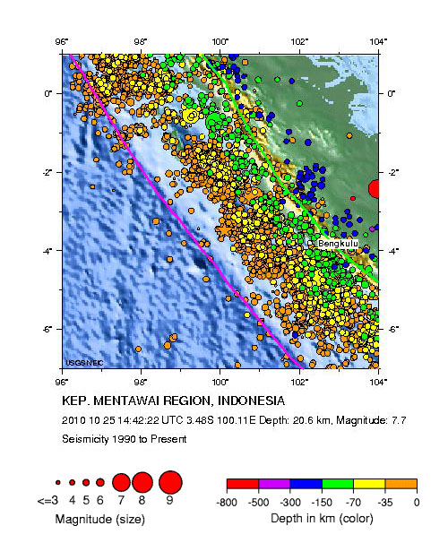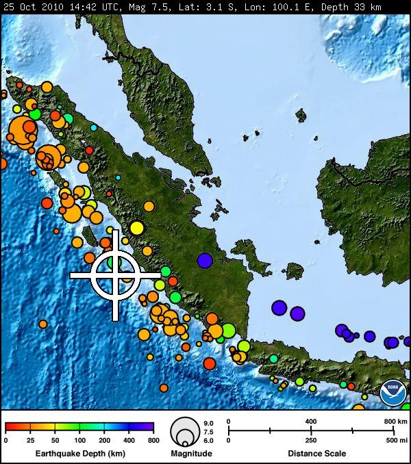 According to the World Data Center for Marine Geology and Geophysics / US National Geophysical Data Center (http://www.ngdc.noaa.gov/hazard/) Global Historical Event databases, over 121 tsunamis have been generated in the Indian Ocean since 326 B.C. These include the 2004 magnitude 9.1 Sumatra earthquake and tsunami that killed almost 230,000 people. Since the 2004 event, two tsunamis in the Sumatra region have caused deaths, in addition to the 25 October 2010 tsunami; these were the 2005 magnitude 8.7 Nias earthquake caused 1303 deaths and an additional 10 deaths due to the tsunami, and the 2006 magnitude 7.7 Java earthquake generated a tsunami that caused 664 deaths. In addition, non-fatal tsunamis were generated by the 2007 magnitude 8.4 Bengkulu earthquake that caused 25 deaths and the 2009 magnitude 7.5 Padang earthquake that resulted in 1,117 deaths. Eruptions from three Indonesia volcanoes also caused fatalities since the Sumatra event: in 2005 Karthala caused one death, in 2006 Merapi (Java) caused two deaths, and in 2010 Sinabung (Sumatra) caused two deaths and Merapi has caused more than 30 deaths.