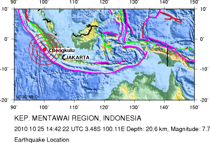 The 25 October 2010 magnitude 7.7 Mentawai, Indonesia earthquake and tsunami caused damage and over 450 deaths in the Mentawai Islands off the western coast of Sumatra, Indonesia. Five minutes after the earthquake, the Indonesia Meteorological, Climatological and Geophysical Agency (Badan Meteorologi Klimatologi dan Geofisika) issued a national warning for a local tsunami, and the Pacific Tsunami Warning Center and Japan Meteorological Agencies issued local tsunami watches seven and nineteen minutes after the earthquake, respectively, to Indian Ocean countries; national authorities are then responsible for issuing warnings to their populations on the tsunami threat to their coasts.
